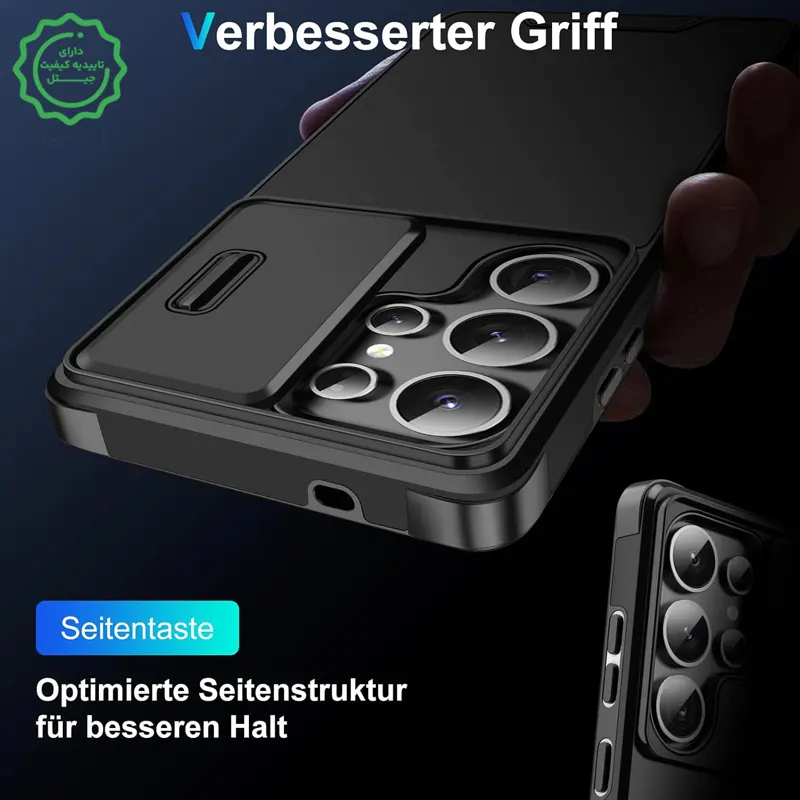 این قاب مناسب برای گوشی S22 Ultra دارای یک پوشش کشویی لنز دوربین است که دوربین گوشی شما را در برابر خراشیدگی، ضربه و حتی "فضولی" محافظت میکند و از افشای حریم خصوصی شما جلوگیری میکند.