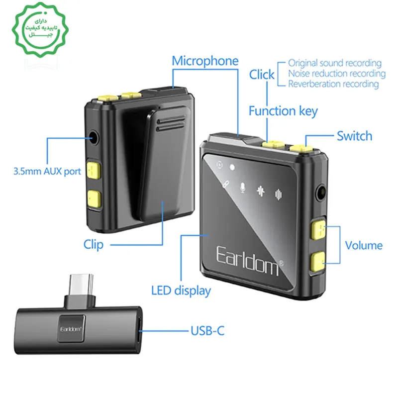 اگر ویدیو تولید میکنی، لایو میروی، کلاس آنلاین داری یا فقط میخواهی صدای «واقعاً واضح» در ویدئوهای موبایلیات داشته باشی، Earldom MC10C همان میانبُر حرفهای است. یک میکروفون یقهای بیسیم با گیرندهی Type-C (سازگار با اکثر گوشیهای اندرویدیِ USB-C) که با Bluetooth 5.2 لینک پایدار میدهد، الگوریتم کاهش نویز داخلی دارد تا نویز باد و همهمه را کنترل کند، و با یک ساعت شارژ حدود ۱۱ ساعت همراهیات میکند. مجموعه با بدنهی ABS مقاوم، برد بیسیم حدود ۱۵ تا ۲۵ متر در فضای باز، نمایشگر/نشانگرهای وضعیت و حتی افکت Reverb (انعکاس) برای رنگدادن به صدای گوینده تکمیل شده است—کافی است دوبار روی دکمهی مربوطه کلیک کنی.