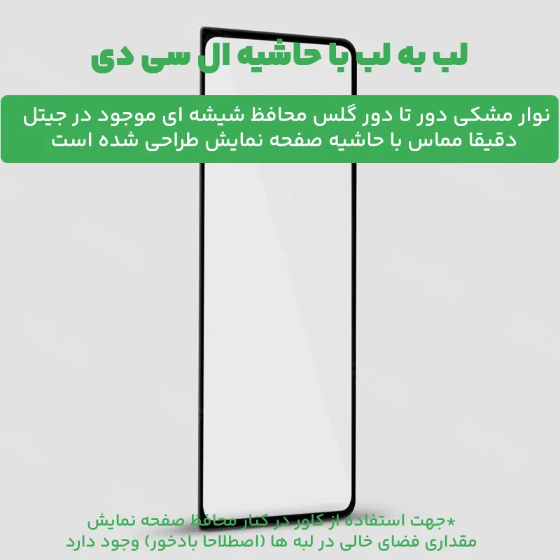 پوشش کامل صفحه نمایش : | لبه تا لبه ، مقداری فضای خالی برای نصب قاب گوشی خالی میماند |