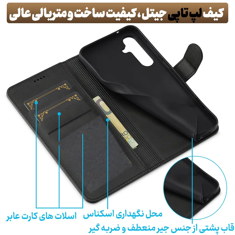 | ویژگی تست و تایید شده توسط کارشناس اکسسوری جیتل : | عملکرد خوب قفل درب کیف ، راحتی استفاده از کارت ها و حس خوب استفاده به دلیل کیفیت خوب چرم به همراه کارایی خوب استند شدن گوشی در زاویه مناسب جهت فیلم دیدن و محافظت 360 درجه و کامل از گوشی و بالابردن عمر گلس محافظ صفحه نمایش |