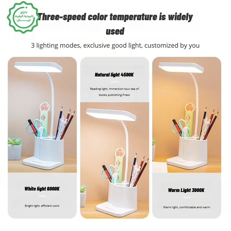اگر دنبال چراغی هستی که بهجای زرقوبرق اضافی، واقعاً کیفیت کار و مطالعهات را بهتر کند، این مدل نقطهٔ تعادل ایدهآل است: نور ملایم و یکنواخت برای چشم، سه حالت رنگی + دیمر لمسی برای هر سناریو، بازوی منعطف برای هدفگیری دقیق و جاقلمی برای نظم میز. یک ارتقای هوشمند برای هر میز کاری—از خوابگاه تا دفتر.