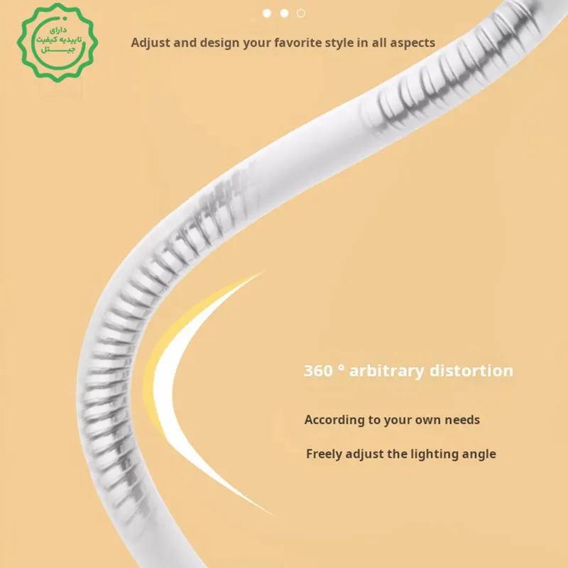 بازوی منعطف + هد قابلچرخش: هد و بازوی چراغ انعطافپذیر هستند تا زاویهی تابش را دقیقاً روی کتاب، صفحهکلید یا دفتر طراحی تنظیم کنی.
