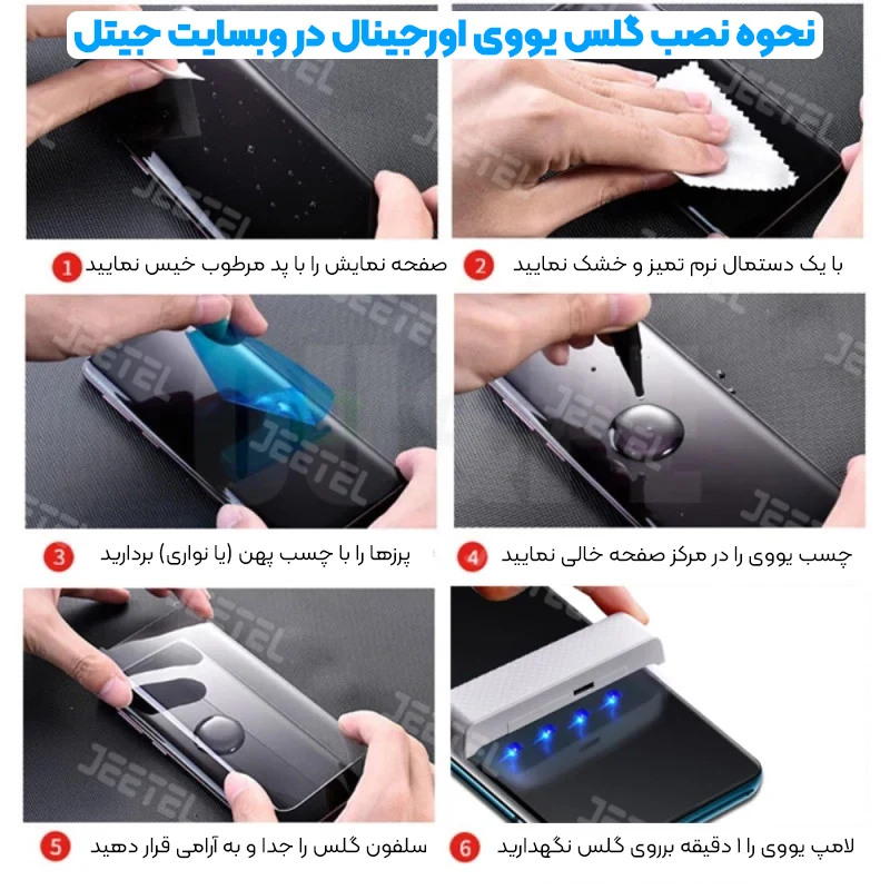 همچنین در جیتل این گزینه وجود دارد که در صورت مرجعه به موبایل فروش برای نصب این محصول گزینه (گلس یووی به همراه چسب مخصوص) را انتخاب نمایید تا از صرف هزینه برای مواردی چون لامپ یووی و کیت نصب (یکبار مصرف) جلوگیری نمایید.