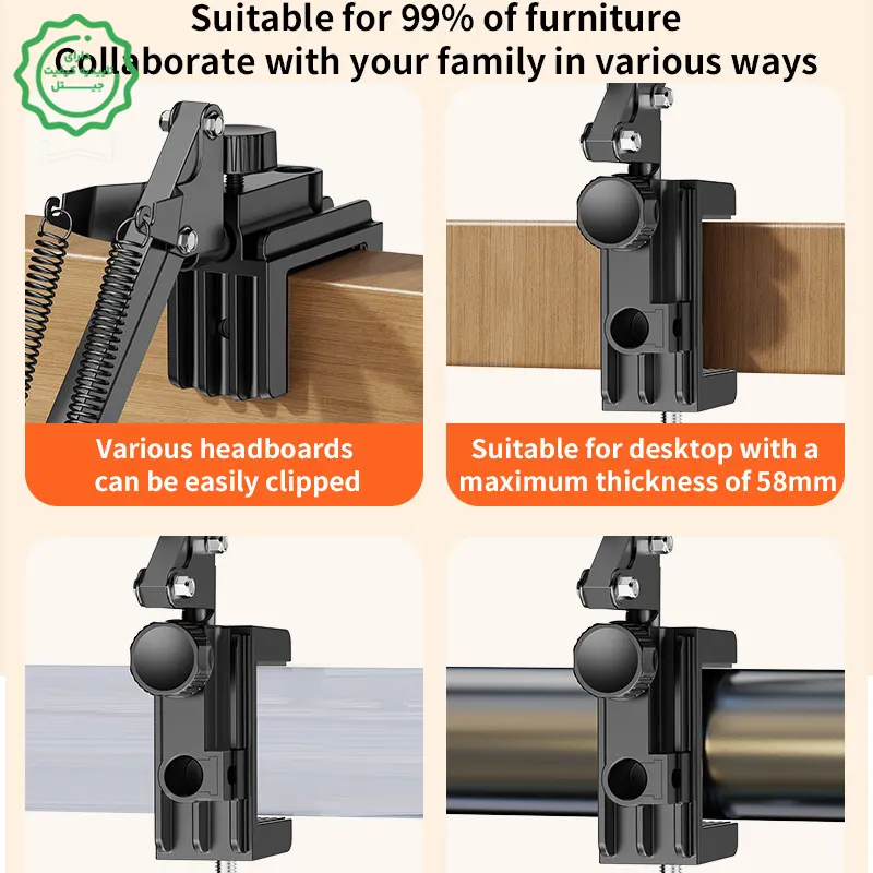 گیرهٔ قدرتمند تخت/میز: نصب سریع روی لبهٔ میز، کانتر یا بالاسری تخت—بدون سوراخکاری.