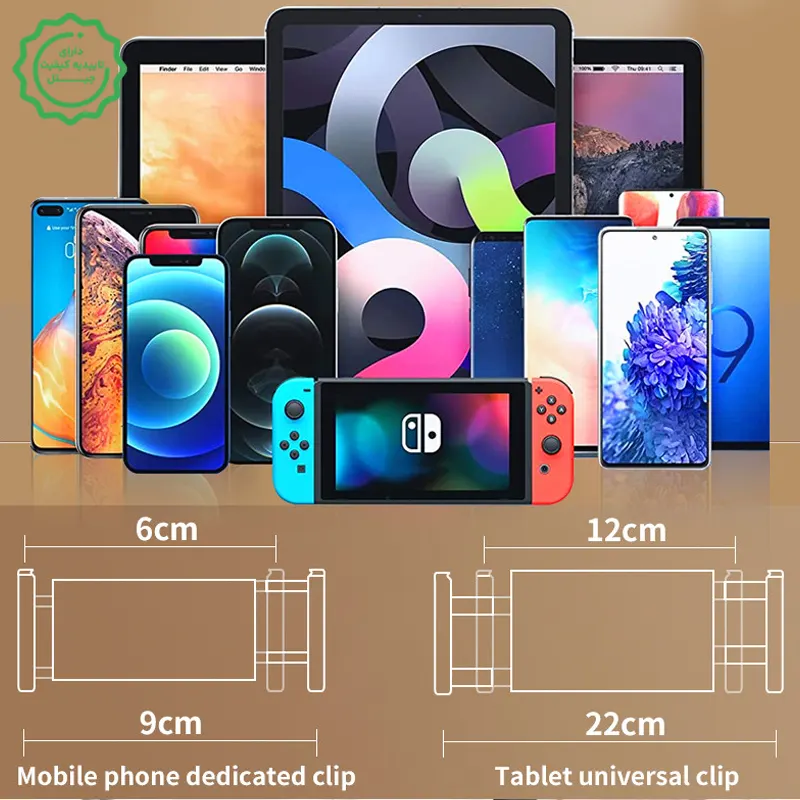 پشتیبانی از موبایل و تبلت: دو هولدر جداگانه (Phone/Tablet)، سازگار با دستگاههای ۴ تا ۱۲.۹ اینچ.