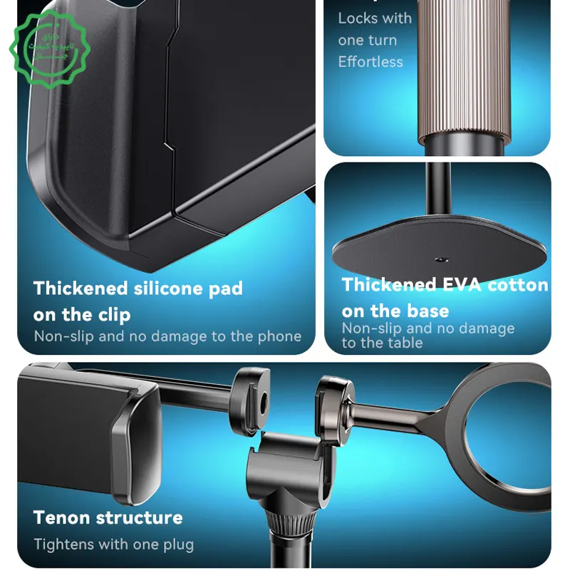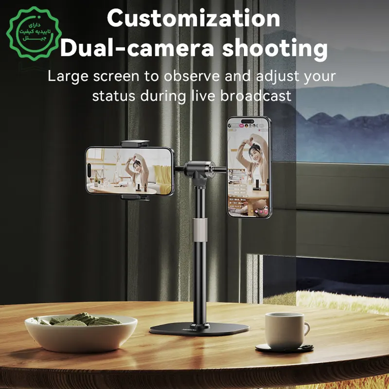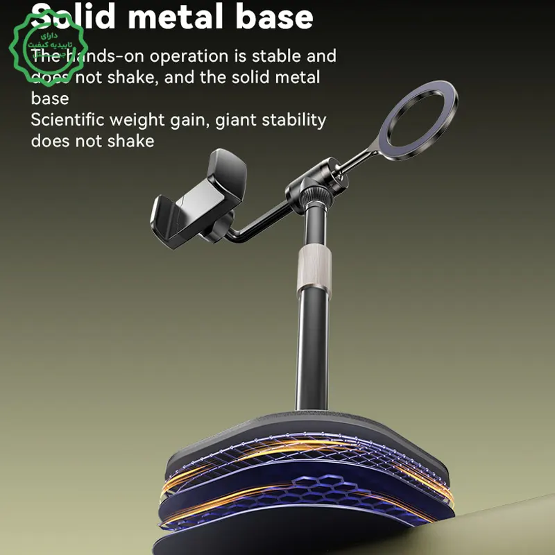 پایداری جدی روی میز: بیس سنگین و بازوی فلزی برای جلوگیری از لرزشهای ریز حین تایپ یا لمس گوشی.