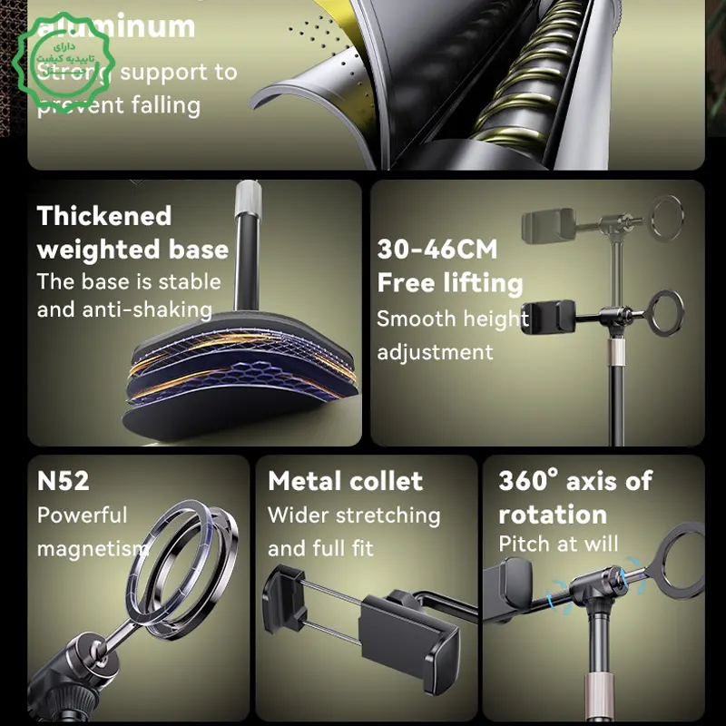به یک استند واقعاً پایدار و انعطافپذیر برای میز کار، لایو، کلاس آنلاین یا تولید محتوا نیاز داری؟هولدر لایو ۳۶۰ درجه Yesido C297 دقیقاً برای همین سناریو ساخته شده: دوحالته (۲در۱) با پد مگسیفِ قدرتمند N52 برای آیفونهای سازگار و گیرهٔ فنری برای همهٔ گوشیها، ارتفاع قابلتنظیم 30 تا 46cm، بازوی تلسکوپی فلزی مقاوم و هد با چرخش ۳۶۰° تا کادر دقیق و حرفهای بگیری.