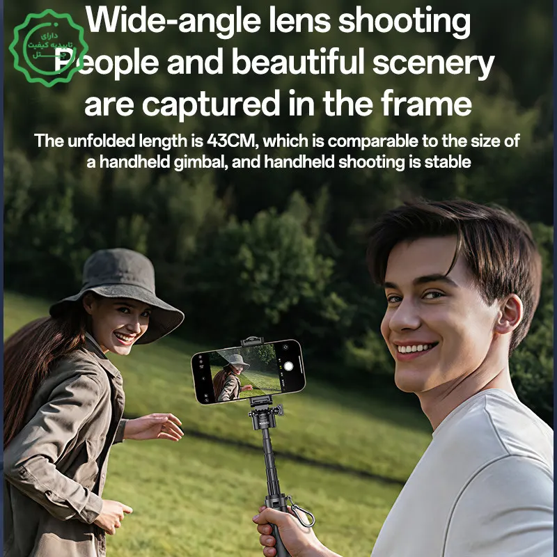 طول بازشونده ۴۳cm: برای کادرهای عریضتر، سلفیهای گروهی یا فریمهای واید.
